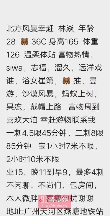 照片都是P的,而且是她年轻时的照片,真人又胖又老了,有小肚子,生过孩子的。服务态度也不好,课表上写的那些根本没做,就是简单的口一下就让你戴套做了,而且不女上,就躺在那不动,不让亲奶子,摸也不让,这就太影响心情了,还催你快点出货,体验太差了,还涨价了,之前她在珠海的,后来去了深圳,现在来了广州,她有个闺蜜叫雨露,也在这的,可以双飞,但是还是算了,服务态度不好,照片也是很多年之前的,现在就是一熟妇又胖又老,还450一课,太坑了。只是她的逼是馒头逼,一线天那种,没什么毛,水挺多的,不是很紧了,还让摸也不让舔。总体太坑了。